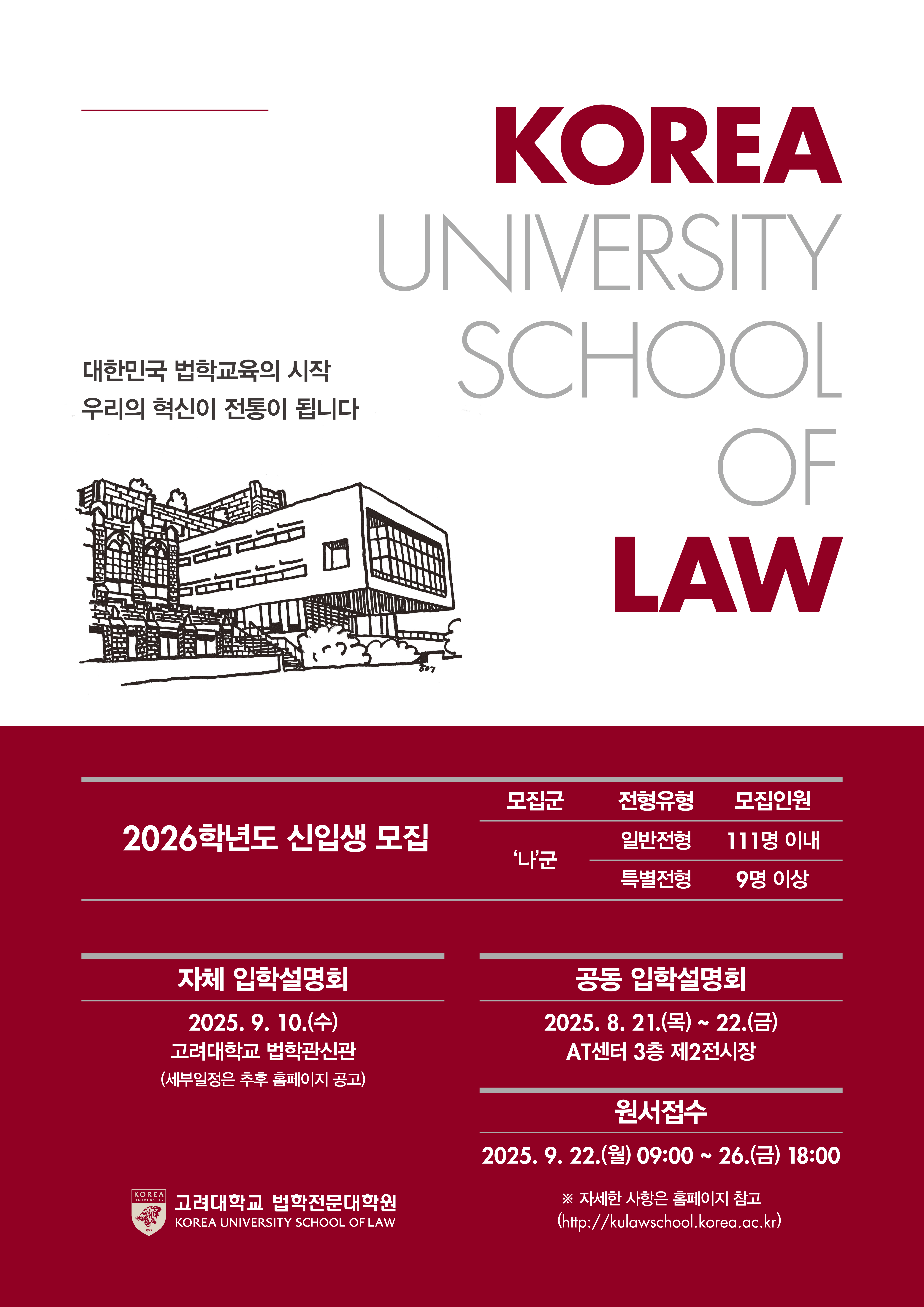 고로 자체 입설 진행하네요 놓치지 말고 다녀오세요들 법학전문대학원 자체입학설명회 개최 장소가 변경되어 아래와 같이 안내드립니다. 1. 일시 : 2025년 9월 10일(수) 19시 ~ 21시 2. 장소 : 고려대학교 법학관신관 202호 3. 비고 가. 자체입학설명회에서는 개별 상담을 진행하지 않습니다. 나. 선착순 입장하며, 참석인원이 많을 경우 안전을 위해 입장이 제한될 수 있습니다.