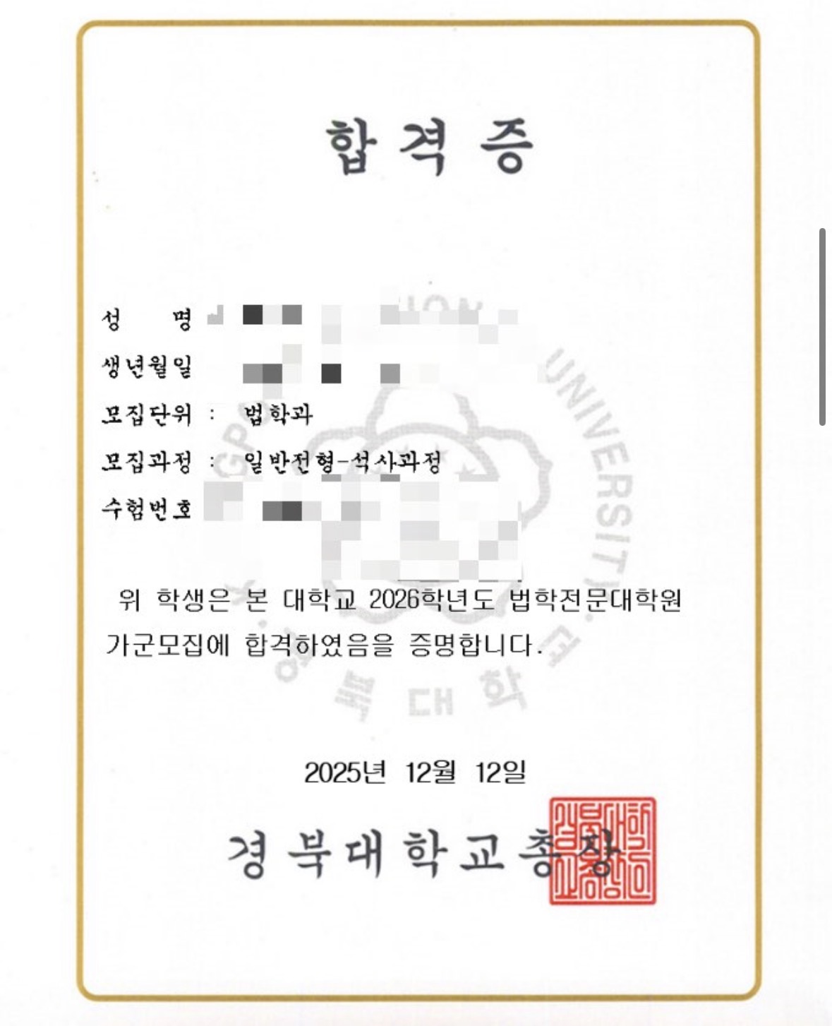 합격소감 1월부터 준비하였습니다. 해커스 로스쿨 인강도 수강하였고, 학기중에는 학부 학점을 20학점이상 병행하느라 시간이 부족했지만 실전연습을 열심히 한 것이 도움이 되었습니다. 준비 과정이 전반적으로 쉽지는 않았지만, 끝까지 해보자는 마음으로 버텼습니다. 돌이켜보면 항상 만족스러운 준비를 했다고 말하기는 어렵습니다. 그럼에도 불구하고 주어진 상황에서 할 수 있는 선택을 하며 준비해 왔다고 생각합니다. 이 글이 로스쿨을 준비하는 분들께 조금이나마 참고 자료가 되었으면 합니다. 다들 올 한 해 좋은 성과 있으시기를 바랍니다 새해 복 많이 받으세요! https://lawschool.hackers.com/?c=event&evt_code=44325322&num=3&memberIdx=8465389&boardIdx=2992&isView=1