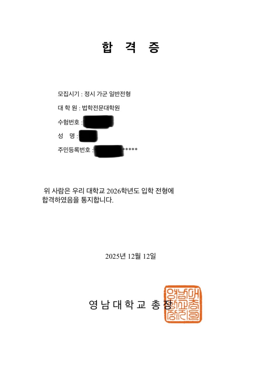 합격 소감 전업으로 입시를 준비했기에 걱정과 불안이 많았지만, 합격 발표 직전에는 초연한 마음이 들기도 했던 것 같습니다. 제가 할 수 있는 한 모든 것들을 쏟아부었다는 느낌 때문이었습니다. 만약 불합격이 뜬다고 해도 또다른 내 길을 찾아야겠다고 생각했던 기억이 납니다. 물론 합격 결과를 보고 정말 기뻤지만요! 처음 로스쿨 입시에 도전하시는 분들이든, 다시 도전하시는 분들이든, 도전하는 스스로를 사랑하는 마음으로 끝까지 최선을 다 하셔서 보람 있는 결과를 쟁취하시기를 기원 드립니다. 시기별/과목별 리트 학습법 처음 LEET를 집에서 모의로 응시했을 때는 점수가 100점대에 머물러 큰 좌절감을 느꼈습니다. 그럼에도 불구하고 막연한 불안에 휩싸이기보다는, 현실적인 목표로 우선 120점대를 넘기자는 기준을 세우고 공부 방향을 정했습니다. 이후 가장 중요하다고 판단한 것은 새로운 문제를 무작정 많이 푸는 것이 아니라, 기출문제에 대한 철저한 분석과 반복이었습니다. 저는 기본적으로 법전협 해설서를 중심으로 기출을 분석하되, 필요에 따라 다른 해설서를 참고하며 다양한 관점을 비교했습니다. 한 문제를 풀더라도 단순히 정답 여부에 집중하기보다는, 출제자가 어떤 사고 과정을 요구했는지, 제가 어느 지점에서 논리적 비약이나 오해를 했는지를 점검하는 데 초점을 맞췄습니다. * 1~3월에는 LEET 전체 기출문제를 빠짐없이 분석하는 데 집중했습니다. 이 시기에는 문제를 푸는 속도보다는 정확한 이해를 목표로 했으며, 후반부에는 잘고른 300제 등을 활용해 기출에서 다뤄진 사고 유형을 다시 점검했습니다. * 4~6월에는 사설 모의고사를 적극적으로 응시하며 현장 감각에 익숙해지는 데 주력했습니다. 단순히 점수에 일희일비하기보다는, 매 시험 이후 오답 분석을 통해 저만의 풀이 기준과 판단 매뉴얼을 만들어 나갔습니다. * 7월에는 사설 모의고사 응시와 함께 그동안 정리해온 매뉴얼을 단권화하는 작업에 집중했습니다. 자주 반복되는 실수, 특정 조건에서 발생하는 논리 오류 등을 정리하며 시험 직전에 점검할 수 있는 자료를 완성했습니다. 이때 다양한 합격 수기의 설명을 참고하기도 했고, 에타에서 매뉴얼을 구하여 틀을 참고하기도 했습니다. 문제 유형, 소재 등을 기준으로 나누어 유의할 점을 좁혀나가기도 하고, 선지 독해에서의 실수를 줄이기 위해 선지 구성 매뉴얼도 정리했습니다. 자소서, 면접 준비 방법 자기소개서를 준비하면서는 먼저 이미 합격한 사례를 참고하는 것이 중요하다고 판단했습니다. 영남대 로스쿨 합격자의 자기소개서를 구해 각 문항에서 어떤 구조로 답변을 전개했는지, 무엇을 중심 메시지로 삼았는지를 분석했습니다. 이를 바탕으로 제 삶에서 활용할 수 있는 경험과 에피소드를 최대한 많이 정리한 뒤, 각 문항별 개요를 작성했습니다. 자기소개서에서는 단순한 경험 나열이 아니라, 학업 및 탐구 능력, 봉사정신, 성실성, 법조인으로서의 비전, 그리고 지역 로스쿨에서의 적응 가능성을 일관되게 드러내는 데 중점을 두었습니다. 각 경험이 제 가치관과 어떻게 연결되는지를 설명하려 노력했고, 무리한 미사여구보다는 솔직하고 일관된 서술을 지향했습니다. 면접 준비의 경우, 10월 초 에브리타임을 통해 두 개의 스터디에 가입해 매주 약 네 차례 토론에 참여했습니다. 토론을 통해 * 제한된 시간(10분) 안에 핵심 논거와 보조 논거를 정리하는 연습, * 바른 자세와 아이컨택을 유지하며 말하는 연습, * 타인의 발언을 경청하고 그 논지를 정확히 파악하는 연습, * 상대방의 발언을 들으며 반박 논점의 개요를 빠르게 정리하는 연습 을 꾸준히 반복했습니다. 매 토론이 끝난 후에는 스스로 부족했던 점을 돌아보며 다음 토론에서 개선하고자 노력했습니다. 후배들에게 하고 싶은 말 입시 과정에서 가장 힘들었던 점은 결과를 예측할 수 없는 불안감이었습니다. 플랜 B가 준비되어 있다면 상대적으로 마음의 부담이 줄어들 수 있겠지만, 그렇지 않은 상황에서는 불안이 따라오는 것이 당연하다고 생각합니다. 저 역시 이러한 감정을 완전히 없애기보다는, 자연스러운 감정으로 받아들이려고 노력했습니다. 입시가 인생의 전부는 아니라는 점을 스스로에게 끊임없이 상기시키며, 행복과 건강, 그리고 자기 자신을 잃지 않으려 애쓰시길 권해드립니다. 공부에 지쳐 집중이 되지 않을 때는 억지로 책상에 앉아 있기보다는, 스스로가 행복해질 수 있는 일을 하며 리프레시하는 시간을 가지세요. 맛있는 음식을 먹거나, 숨이 찰 정도로 러닝을 하며 몸을 움직이는 것이 그 예가 되겠습니다.