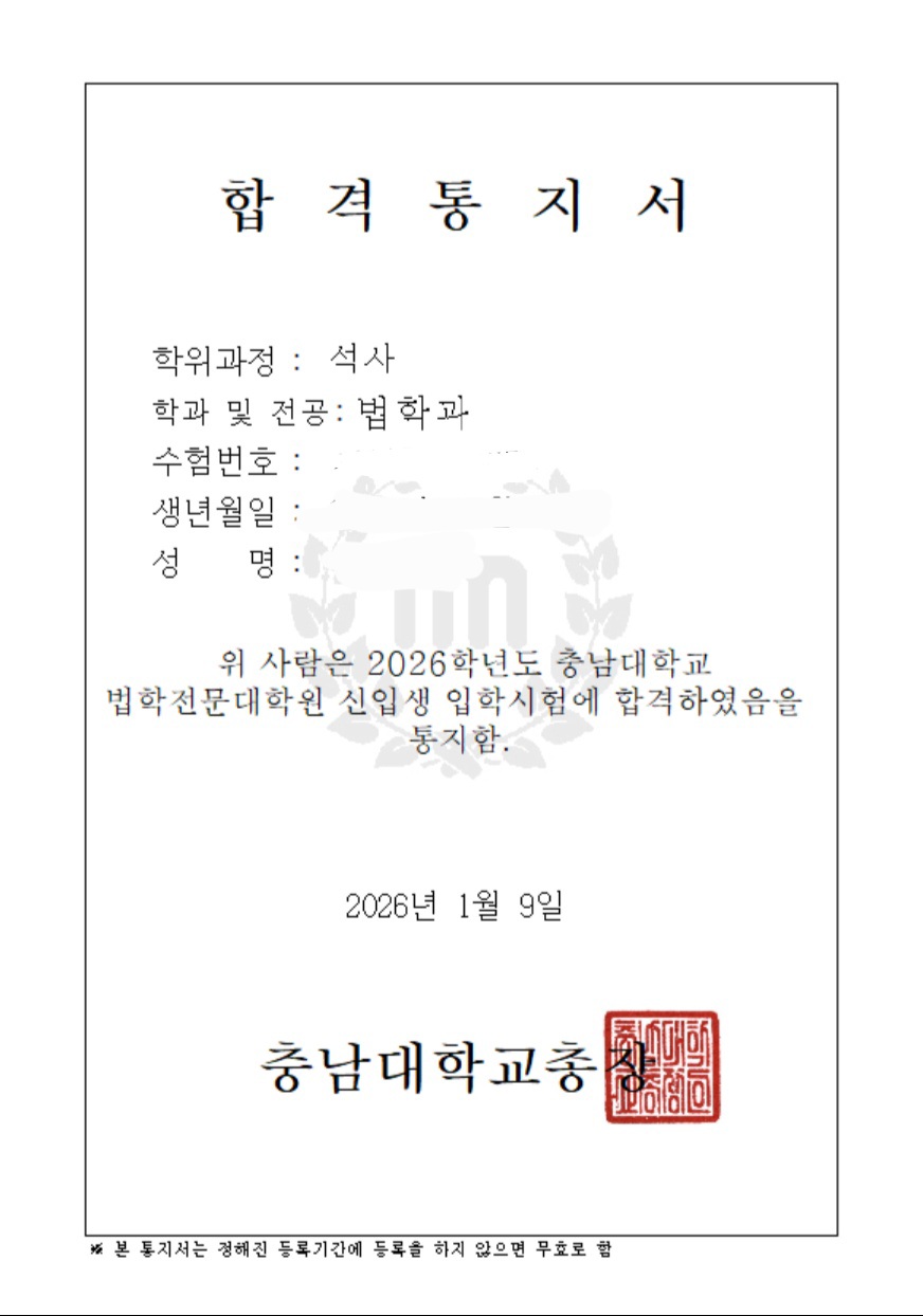 합격 소감 오랜 기간 준비한 후 합격한 거라 더욱 기쁘고 각오가 남다른 것 같습니다. 무엇보다도 빨리 법 공부가 하고 싶다는 생각이 큰 것 같습니다. 같은 해 합격하신 모든 로스쿨 입학생 분들께도 축하의 말씀을 전하고 싶습니다. 시기별/과목별 리트 학습법 초시(2024학년도) 117점(언어 17개, 추리 26개), 자 시(2025학년도) 100점(언어 13개, 추리 27개)토 Post-LEET도 할 수 없었던 점수를 받고 다른 진로를 진지하게 고민했습니다 삼시를 준비하면서 했던 가장 큰 마음가짐은 '재시처 럼 하지 말자'였습니다. 재시를 준비할 땐 1월부터 유 경한 학원의 패스권을 끊고 매일 아침 9시에 학원어 서 강의를 듣고 저녁 10시까지 자습실에서 자습을 하 고 귀가했으며. 학원에서 제공하는 모든 특강, 코칭 프 로그램 및 학생 스터디에 참여했습니다. 삼시에는 0 모든 과정을 생략하고 문제 풀이를 위해서는 어던 스 을 글을 읽어야 하는지, 문제를 풀며 생각이 꼬이는 부 분에서 어떻게 대처해야 하는지를 연습하는 것에 집 중했습니다. 사람마다 차이는 있겠으나 개인적으토 제를 과하게 많이 다루고 꼼꼼한 해설과 오답노트 를 만드는 것이 전반적인 시험 운용을 망치는 독이 될 수도 있다고 생각합니다. 또한, 학생들끼리 진행하는 스터디도(특히 추리논증은) 추천하지 않습니다. 수험 에 필요한 논리를 정확히 파악하고 있어 매번 추리논 증 40문제 중 30개 이상 맞추는 학생을 멘토로 활용 하는 스터디가 아닌 이상 못 하는 사람들끼리 모여서 문제 풀이와 자신들의 논리를 공유하는 것은 정말 아 무 도움도 되지 않습니다 기본에 충실하되 과한 부분들을 빼는 것이 삼시에 그 나마 원서 접수가 가능한 점수라도 받을 수 있게 한 부 분이라고 생각합니다 자소서, 면접 준비 방법 축남대학교는 [1. 지원동기 300자. 2. 학업 과정 500 자]로 분량이 매우 짧습니다. 따라서 이전에 썼던 많 은 분량을 밀도 있게 압축하는 과정이 생각보다 힘들 었던 것 같습니다. 학업 과정은 이전에 작성한 전남대 자소서 항목을 수 정하여 작성했습니다. 지원동기 항목의 경우. 기존어 작성한 '공익변호사' ver. 외에도 충남대의 특성을 고 려하여 '중소기업을 대변하는 변호사'ver.를 추가적으 로 작성했고 최종적으로 후자의 내용을 선택했습니 다. 후배들에게 하고 싶은 말 (3년인 듯한) 1년의 입시 과정을 마무리하며, 미약히 지만 저의 경험이 앞으로 로스쿨 진학을 희망하시는 동문분들께 도움이 될 수 있었으면 하는 마음입니다 추가적으로 궁금하신 사항이 있으신 분들은 댓글, 쪽 지로 연락 주시면 최대한 빠른 시일 안에 성실하게 답 변 드리도록 하겠습니다. 감사합니다