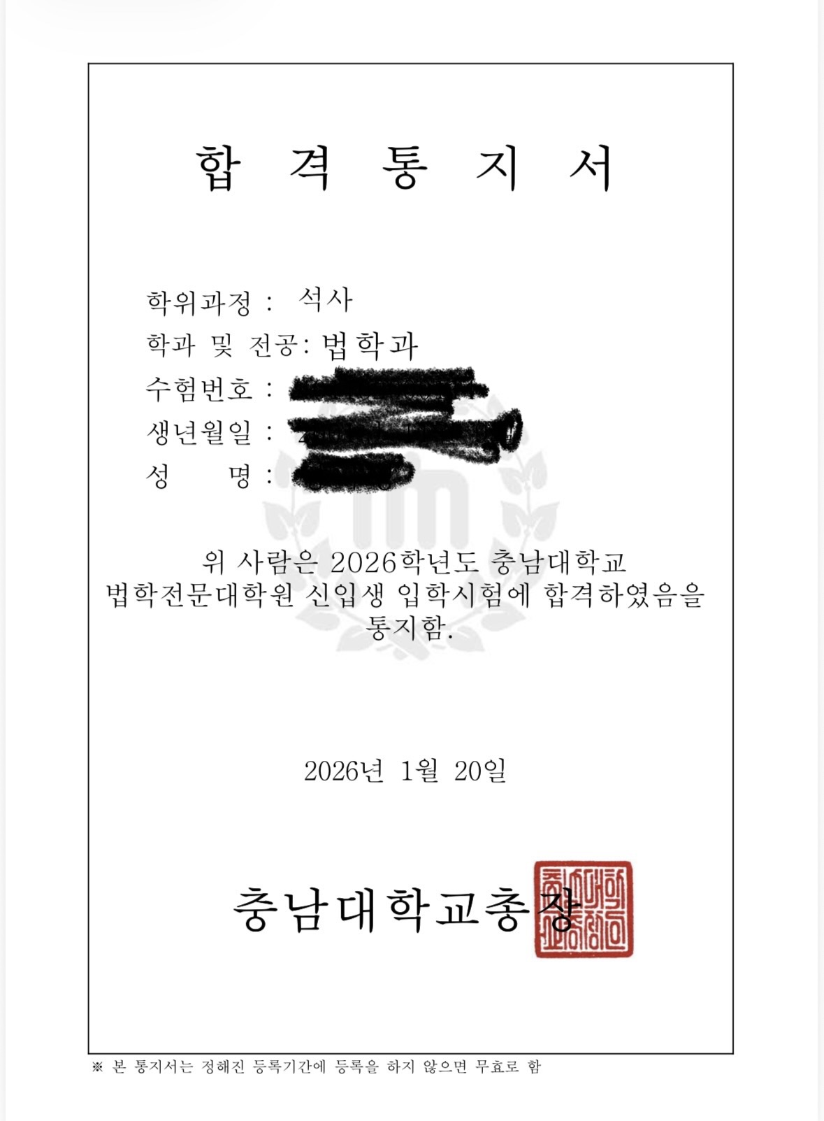 합격 소감 무정성 학부생이어서 걱정을 많이 했는데, 다행히 합격하게 되어 너무 기쁩니다ㅎㅎ 충남대는 초고학/고학을 좋아하기로 유명하고, 또 고학 지원자들이 많기도 한데 학점이 높지 않음에도 불구하고 합격해서 다행이라고 생각합니다ㅠㅠ 충남대 지원하실 중저학 분들은 리트 점수가 안정적이시거나, 조금의 정성요소라도 있는 게 좋을 것 같아요! 시기별/과목별 리트 학습법 저는 모의고사 점수에 비해 실릿이 좀 많이 안 나온 편인데, 일단 무조건 리트는 긴장하지 않고 차분하게 푸는 것이 그 무엇보다 중요한 것 같습니다…! 아무리 기출 많이 돌리고 문제 많이 풀어봤자 당일날 너무 긴장하거나 컨디션이 안 좋으면 끝장이라…ㅠㅠ 꼭 마음 편히 보시길 바랍니다! 저는 졸업유예 후 전업으로 리트 준비를 했는데, 우선 1~3월은 추리논증 기본강의(인강)를 들으며 다양한 유형에 익숙해지는 걸 목표로 했습니다. 언어는 점수가 원래 나쁘지 않았어서 기출 공부 외엔 따로 공부하지 않았습니다. 6월 초까지는 전개년 기출 분석을 하며 피셋 문제도 병행했습니다. 리트 스터디도 했었는데, 꾸준히 문제를 풀 수 있도록 강제가 된다는 점과 서로 풀이법에 대해 다양한 이야기를 나눌 수 있다는 점이 좋았습니다. 시간이 많으신 분들은 스터디도 괜찮은 방법인 것 같습니다. 피셋은 리트보다 타임어택이 심한 편이라 시간 관리 훈련 용도로 풀어보시는 것 나쁘지 않은 듯 해용! 6월~7월 리트 전까지는 사설 모의고사도 종종 치러 가고, 집에서도 사설 풀고 기출 복습하며 시간을 보냈습니다. 그냥 기출 논리 잘 이해하고, 긴장하는 타입이라면 사설 모의고사 몇 번 치르며 차분히 시험 보는 훈련을 하는 게 가장 좋은 것 같아요! 자소서, 면접 준비 방법 자소서는 8월 중반 즈음에 쓰기 시작한 것 같습니다. 우선 학교별로 초안을 잡아둔 뒤, 로스쿨 준비 카페 등에서 첨삭해주실 로생 선배들 몇 분을 구했고, 주변 지인들 몇 명에게도 부탁해서 첨삭받았습니다. 정말 도움이 많이 되었던 유료첨삭도 있었고, 추상적인 말씀만 하시는 분들도 계셔서 복불복인 것 같아요… 한 번에 몇 회씩 하기보다는 우선 1회 첨삭 받아보고 본인이랑 잘 맞는지 확인한 뒤 추가 회차 맡기시는 게 좋을 듯 합니다. 면접은 원서 접수 끝나갈 때쯤 학교 에타에서 스터디를 지원교별로 한 곳씩 구해서 두 곳 합쳐 주4회씩의 면접 스터디를 통해 준비했습니다. 면접을 잘 못하는 편이라 많이 걱정했는데, 그래도 계속 스터디에서 연습하다보면 조금은 느는 것 같습니다…! 후배들에게 하고 싶은 말 [리트] 마음 조금 내려놓고 보기가 가장 중요한 것 같아요! 저도 실릿때 너무 긴장해서 글이 안 읽히고 멘붕 오고 난리났었거든요…ㅠㅠ 나한테 어려우면 남들한테도 어려울 거란 생각을 가지고 멘붕하지 않고 뭐라도 풀어내려고 끝까지 노력하기…! [포릿] 자소서 생각보다 많이.. 갈아엎게 됩니다.. 본인이 진짜 평소에 글을 잘 쓰는 편이라면 모르겠지만, 보통은 내가 잘 썼다고 생각해도 첨삭받을 때 갈아엎게 되기 때문에… 그래서 미리미리 조금씩이라도 써놓는 게 중요한 것 같아요! 그리고 면접스터디도 늦장부리면 스터디 구하기 힘들 수 있습니다ㅠ 웬만하면 원서 접수 끝나갈 때쯤 글 올리거나 에타 검색해서 빠르게 구하세요!! 그리고 진짜 정량이 다가 아닙니다…! 정량도 중요하지만 당락을 결정짓는 건 포릿이기 때문에 포릿 포기하지 않고 끝까지 잘 완주하시길 바래요! 모두 화이팅입니다!