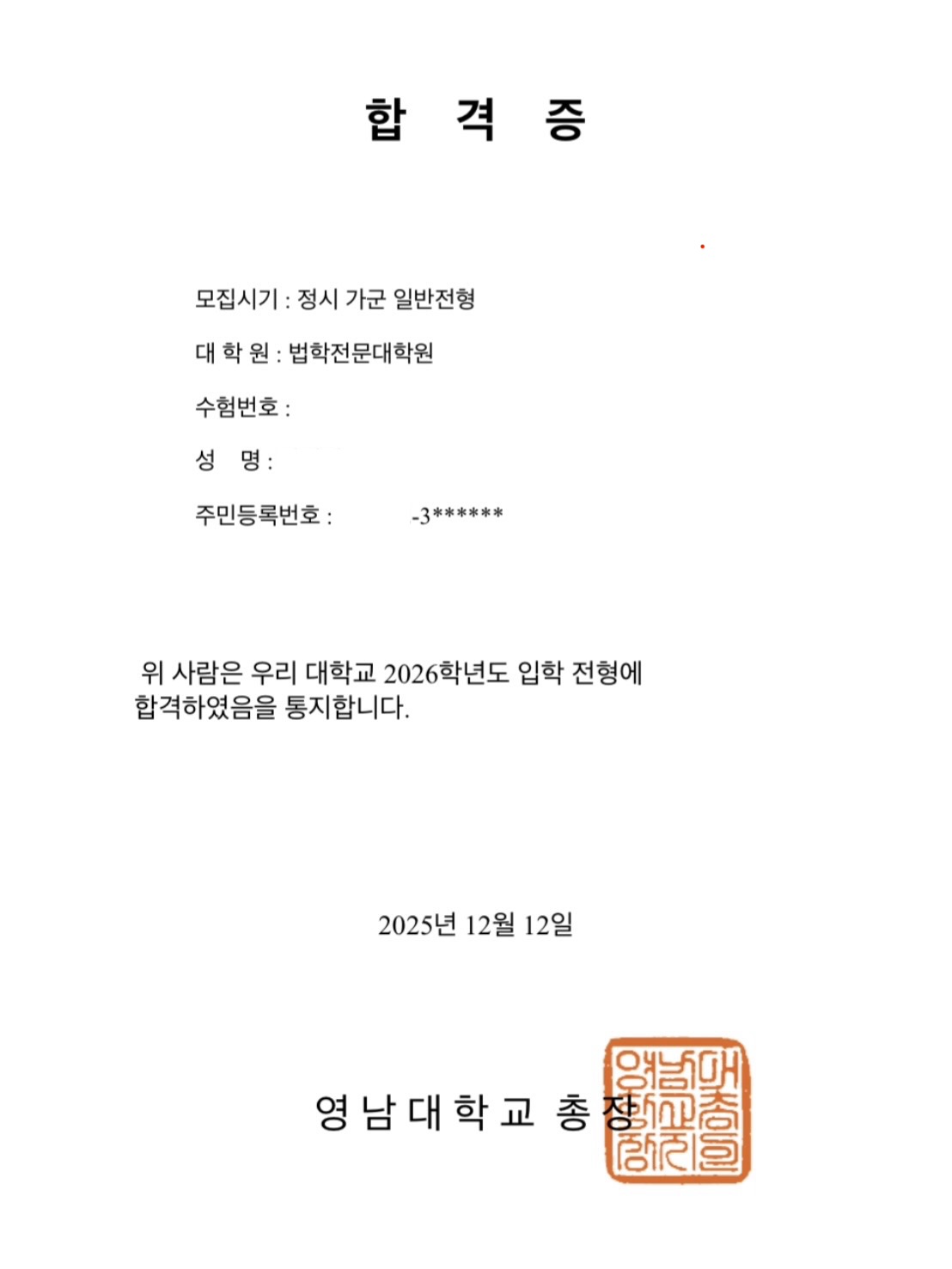 합격 소감 우선 다년에 걸친 입시 끝에, 노력의 결실을 맺을 수 있게 되어 기쁠 따름입니다. 법학적성시험을 다회 치르며 ‘이 길이 내 길이 아닌가?’라는 생각을 수없이 해왔기에 기쁨이 배인 것 같습니다. 힘들게 얻은 기회인 만큼 매일매일을 소중히 여기며 더욱 열심히 정진해 나가겠습니다. 시기별/과목별 리트 학습법 언어이해는 비교적 자신이 있었으나, 언제나 제 발목을 잡은 것은 추리논증이었습니다. 특히 어릴적부터 수학에 큰 재능이 없었던 만큼, 토지 면적 계산과 같은 단순 계산문제에서 조차 겁먹고 시작하기 일수였습니다. 저에게는 오히려 사람들이 많이 추천하는 형식논리 등으로부터 거리를 두고, 어떤 문제든 별거 아니라는 마음가짐이 큰 도움이 되었습니다. 어려운 셈 문제는 어차피 복잡하게 풀어도 틀릴거라 생각하고 넘기기도 했습니다. 고득점을 바란 것은 아닌 만큼 간단하고 단순하게 생각하는 것이 도움이 된 것 같습니다. 자소서, 면접 준비 방법 자기소개서는 전년도에 써 둔 바 있기에 그것을 바탕으로 써갔습니다. 이때 재시를 하며 짧게라도 인턴을 한 것이 소중한 글감이 되어주었습니다. 리트 전업 재시 시 시간이 어느 정도 남기 마련이기에 인턴같은 활동 적극 추천합니다. 자소서는 스펙 나열이 아닌, 자신의 서사를 소개하는 글이라는 본질을 잊으면 안된다고 생각합니다. 교수님이 한 번 더 눈이 가는 글을 쓰는 것이 중요하다고 하는데, 가장 창의적인 것은 가장 개인적인 것이라는 말을 기억하시길 바랍니다. 면접은 스터디/학원 강력히 추천합니다. 아무리 큰 의미 없다고 알려진 로스쿨 조차 영향이 없다고 볼 수는 없는 것 같습니다. 후배들에게 하고 싶은 말 재시를 하며, 먼저 입학한 동기들로부터 로스쿨 생활이 힘들다는 말을 정말 많이 들었습니다. 이때 부러워하기 보단, 내가 하고 있는 공부가 얼마나 작은 것인지 자각할 수 있었던 게 큰 도움이 된것 같습니다. 리트 별거 아닙니다. 설령 저처럼 점수가 안나와도, 별거 아니라는 마음가짐으로 묵묵히 해나가시길 바랍니다.
