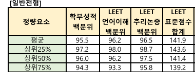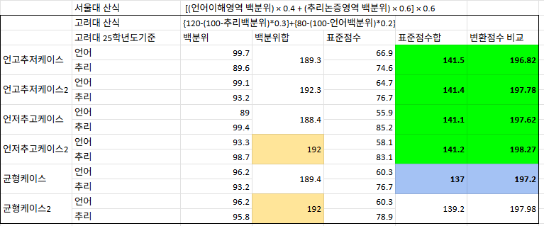 오늘은 리트 점수 최상위권 학생분들을 위한 알쓸신잡(?) 표준점수 vs 백분위 계산 편입니다. 아직 성적이 나온 때도 아니고, 실제 지원할 때도 아니니까 이런 것도 있구나 하고 생각해봐주시면 되겠습니다. 대부분의 학교는 정량 계산시 표준점수로 계산하는데요. 백분위로만 계산하는 학교가 2군데 있죠. 서울대와 고려대입니다. 2번째 이미지를 바탕으로 결론만 먼저 정리해보자면. 1) 표준점수가 비슷하다면, 언저추고 > 언고추저 순으로 좋다.(표점 0.3점 차이가 변환점수로는 1.5점 차이까지 날 수 있음) 2) 백분위 합이 비슷하다면, 언저추고 > 균형이 좋다. 3) 균형 표점 137라면, 4.5점 차이인 표점 141.5 언고추저를 변환점수로 이길 수 있다. 3번째 이미지 25학년도 선발결과를 보면 상위 75% 표점이 139.2로 나오는데요. 아마도 언어 24개(60.3점/96.2%), 추리34개(78.9점/95.8%)라고 추정해볼 수 있겠습니다. 표점은 숫자가 딱맞아 떨어지기 어렵거든요. 언어 추리 각각 6개씩만 틀려도 안정권이 아니라니.. 상위 25% 표점 도 143.6인걸보면 상위권 균형, 언저추고인 137~145 정도 구간에서 한문제 차이, 백분위 차이로 치열하게 정량 점수가 갈릴거라고 예상해볼 수 있겠습니다. 저는 가지 못했지만 여기 계신분들은 고득점에 성공하셔서 성적표를 받고 이런 계산까지도 해보시는 날이 오기를! ㅎㅎ